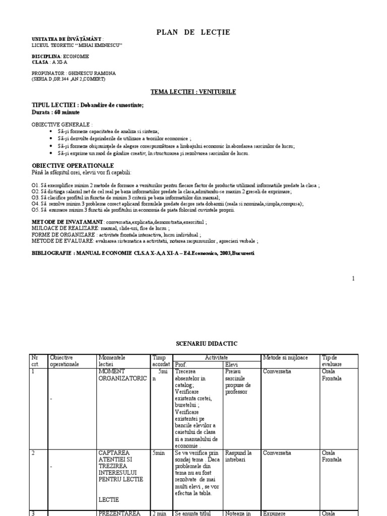 Plan De Lectie Economie