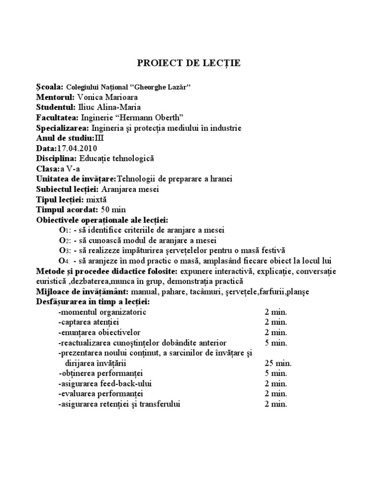 Proiect Lectie Aranjarea Mesei