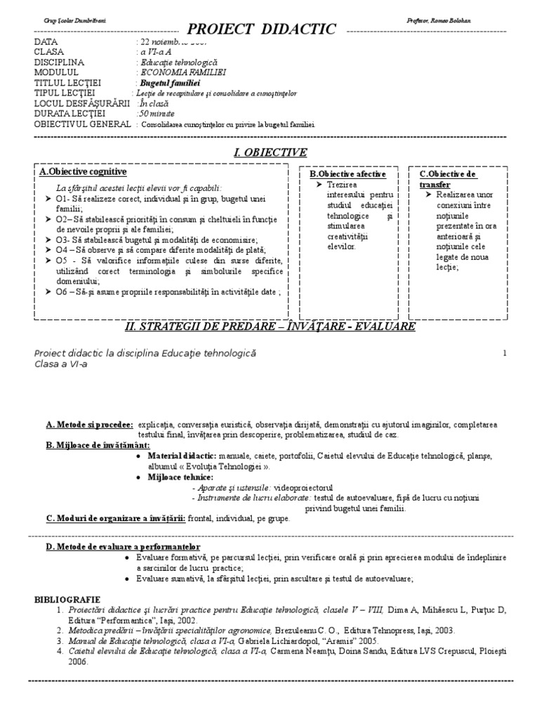 Proiect Lectie Bugetul Familiei Cl Vi Doc