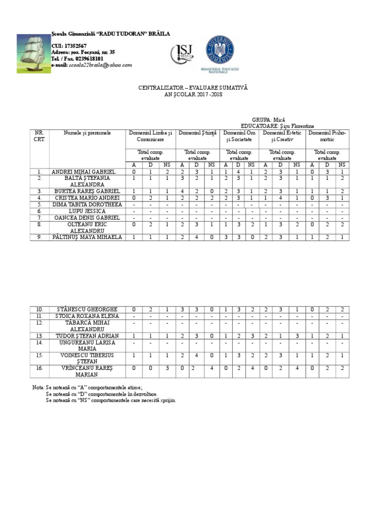 Raport De Evaluare Finală Grupa Mica Kindergarten Transportation Kindergarten Mica