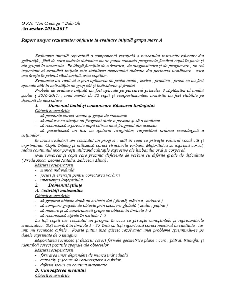Raport Asupra Rezultatelor Obtinute La Evaluarea Initiala Grupa Mare